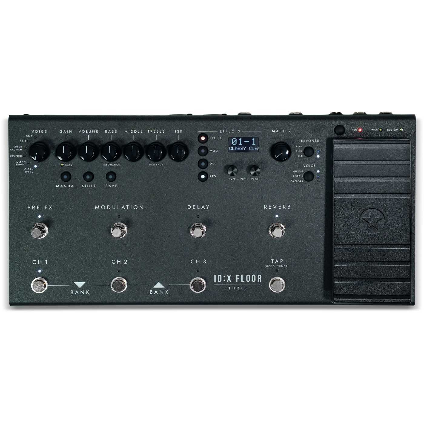 ID:X Floor Three erbjuder tolv autentiska modelleringar av klassiska förstärkare – sex originalmodeller från Blackstar och sex Ampton-rekreationer av ikoniska förstärkare – samt tre basförstärkare och två akustiska simulatorer. Valbar slutrörsrespons (EL84, EL34, 6L6) och Blackstars patenterade ISF-kontroll säkerställer att varje modell levererar en äkta känsla av en rörförstärkare. Den inbyggda pedalen ger realtidskontroll över wah, volym eller effektparametrar för uttrycksfullt spel, och den integrerade effektloopen öppnar för kreativa routingsmöjligheter med externa pedaler eller effektenheter.