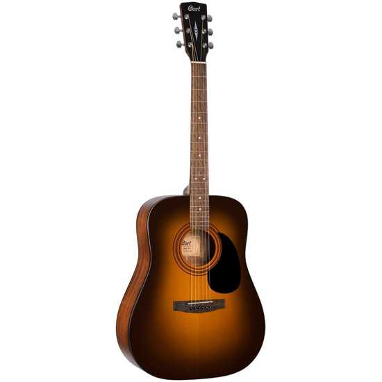 AD810, här i utförandet Satin Sunburst, är en akustisk dreadnought från Cort med sidor och botten i okoume (afrikansk mahogny), topp i gran, hals i mahogny samt greppbräda i merbau.
