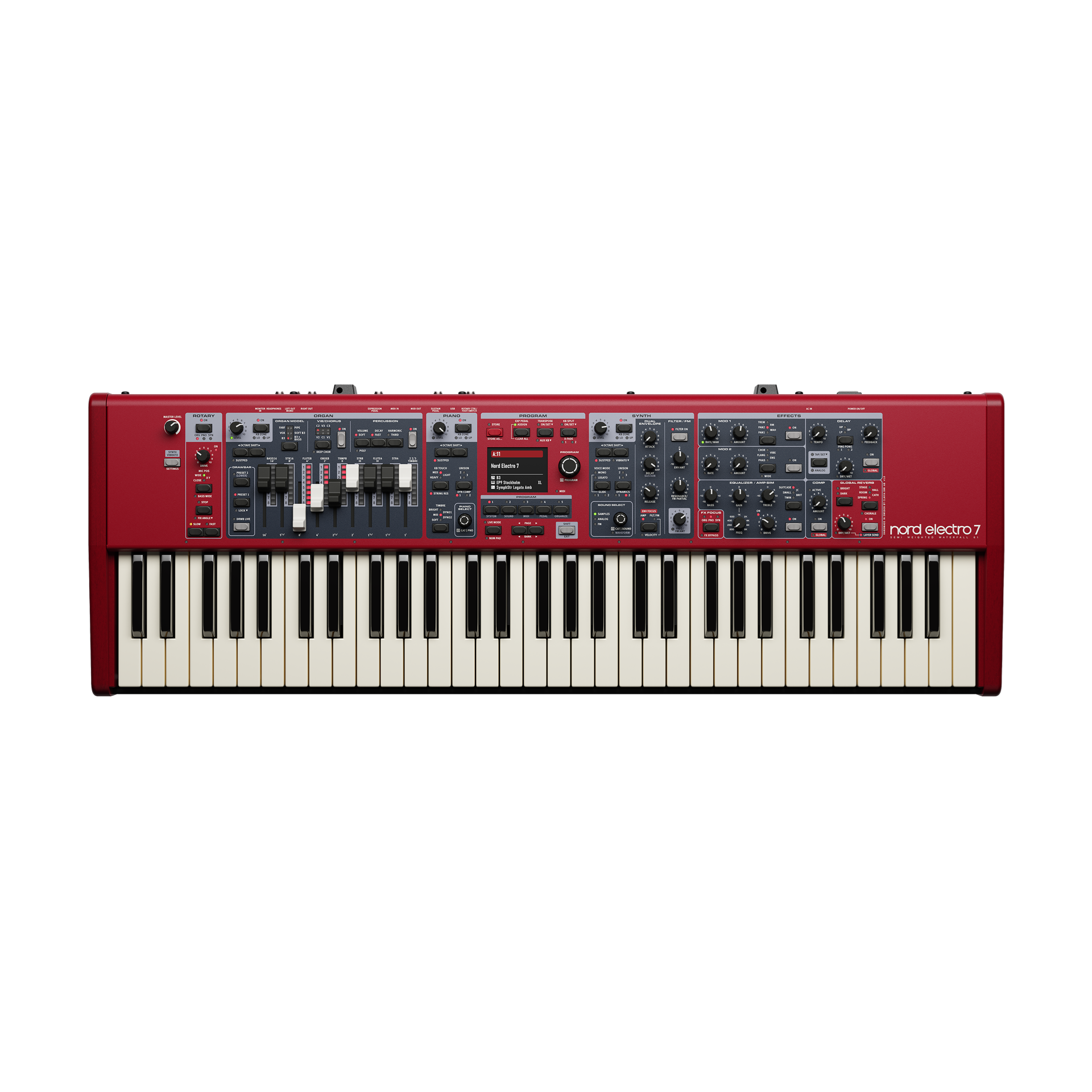 Nord Electro 7 tar Electro-serien till nästa nivå med en helt ny Synth-sektion, dedikerade effekter per sektion och en uppdaterad paneldesign med stor högupplöst färgdisplay. Med Nords senaste pianofunktioner samt orgel- och rotary-emulering från Nord Organ 3 erbjuder Electro 7 maximal flexibilitet i ett lätt, scenredo instrument.