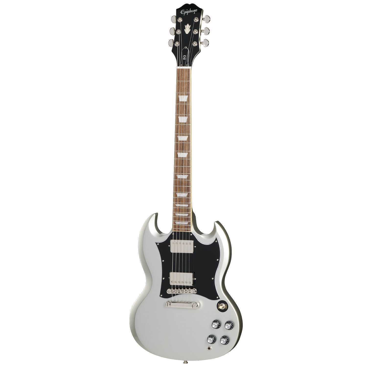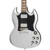 Epiphone SG Standard i serien Inspired By Gibson. Kropp i mahogny, hals i mahogny, greppbräda i lagerträ samt förnicklad hardware. Mikrofoner: 1st ProBucker-2™ och 1st ProBucker-3™. Färg: Silver Mist. Elgitarren levereras med en premium Epiphone gigbag.