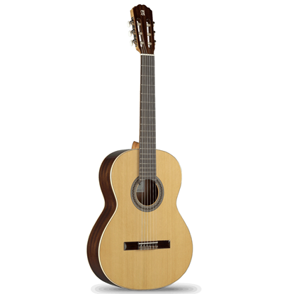 Spansktillverkad klassisk nylonsträngad gitarr. Sidor och botten i mahogny, topp i solid ceder, hals i mahogny samt greppbräda i indisk rosewood. Levereras med Alhambra 9730 gigbag med 10 mm stoppning.