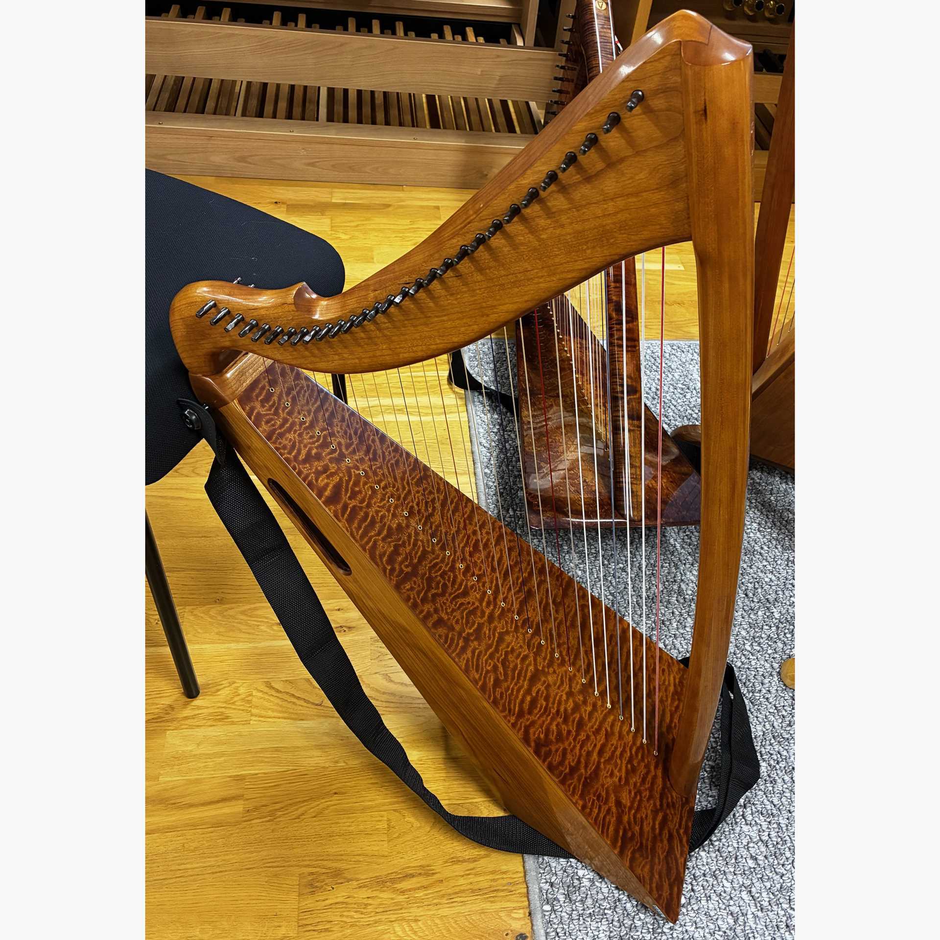Beyond the look and tone, this harp is designed specifically for comfort. The cant of the neck, the angle of the base, the asymmetrical sound chamber, and the balance point all make this harp sit gracefully on your lap with little to no effort.