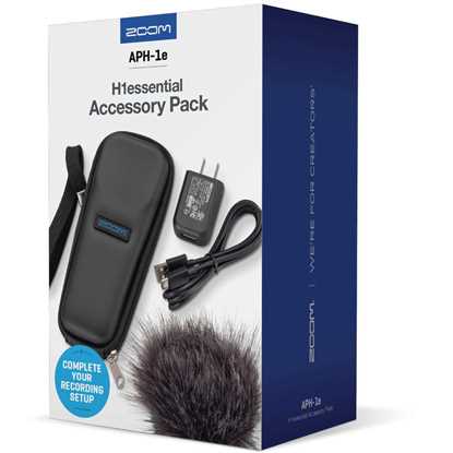 APH1e är ett prisvärt tillbehörspaket till Zooms inspelare H1essential. Paketet innehåller en vadderad förvarings- och transportväska, en vindpäls, nätadapter AD-17 samt en USB C-kabel.