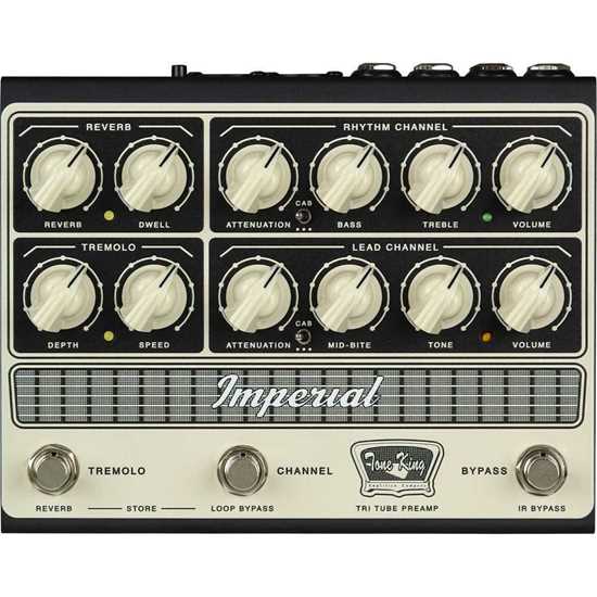 Tone Kings Legendariska Imperial förstärkare i pedalformat. Drivs av 3st 12AX7 rör. Inbyggt i pedalen finns även reverb och tremolo som du också hittar i förstärkaren.